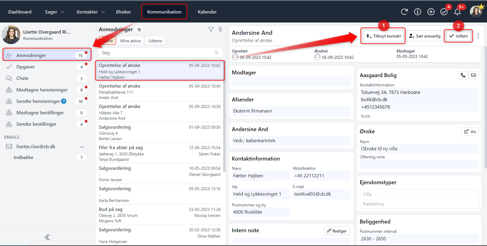 Når det er tjekket af, og du har tilknyttet kontakten til det modtagende ønske, så kan du arbejde videre med Ønsket og efterfølgende få udført og fjernet anmodningen.